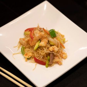 Fideos de arroz con gambas y verduras
