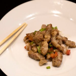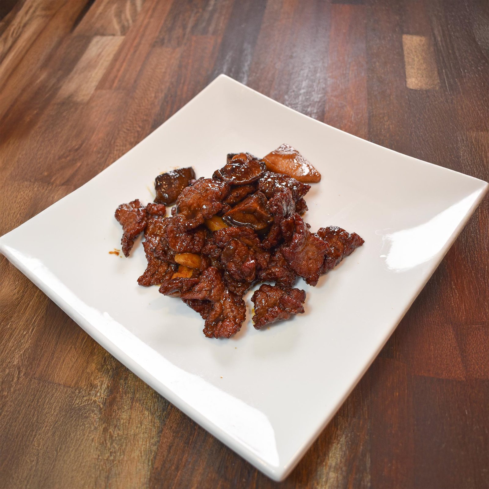 Trocitos de ternera con shitake y bambú