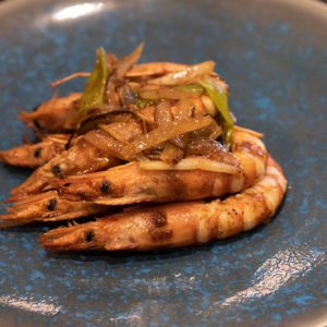 Gambas, carne de cerdo cha sao y verduras con sabor picante