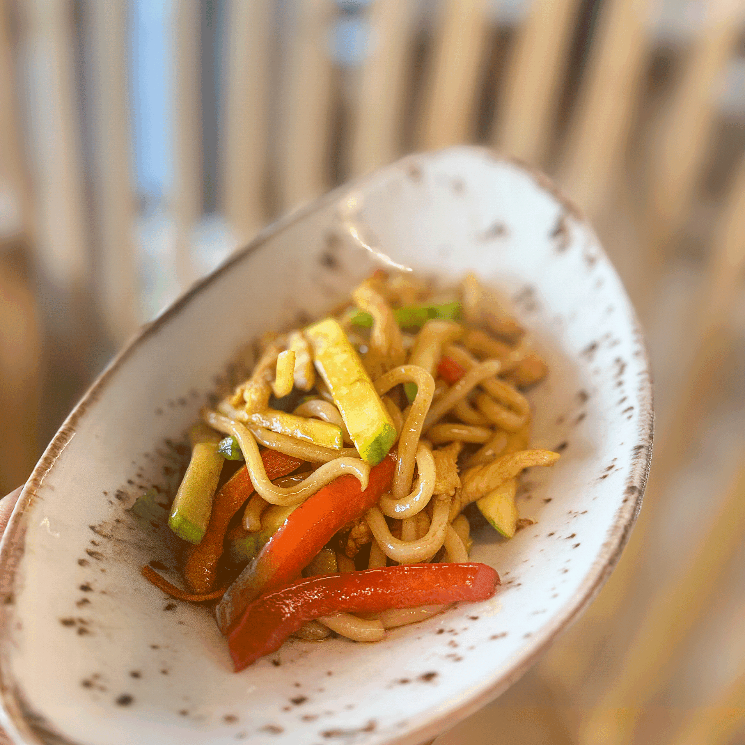 Udon con pollo, verduras y soja estofada
