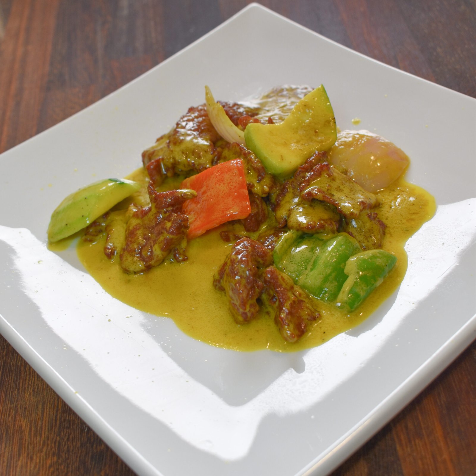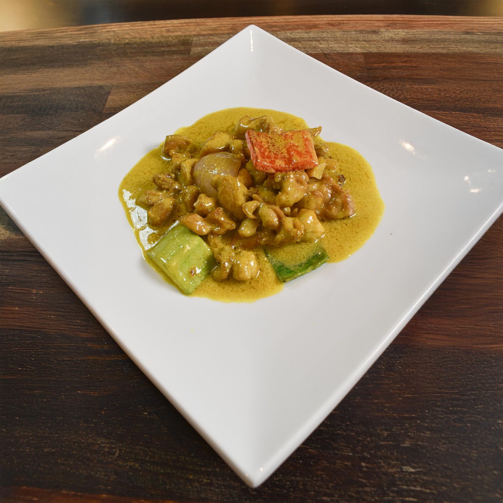 Trocitos de ternera con salsa de coco, aceite y curry verde